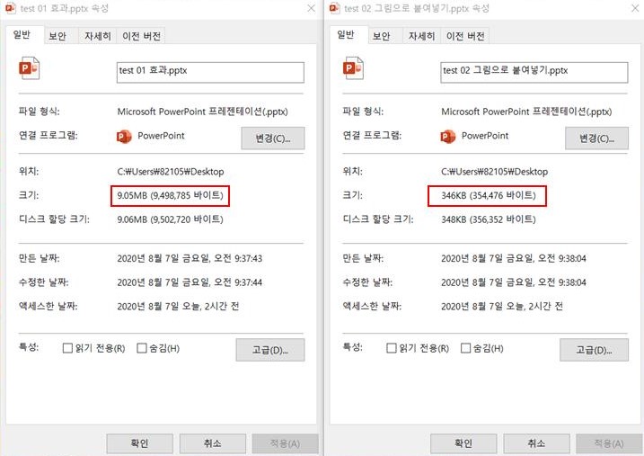 정말 많이 줄었죠? 그림 압축을 하지 않고, 이렇게 그림으로 붙여넣기 기능 활용만으로도 PPT 용량을 줄일 수 있답니다!